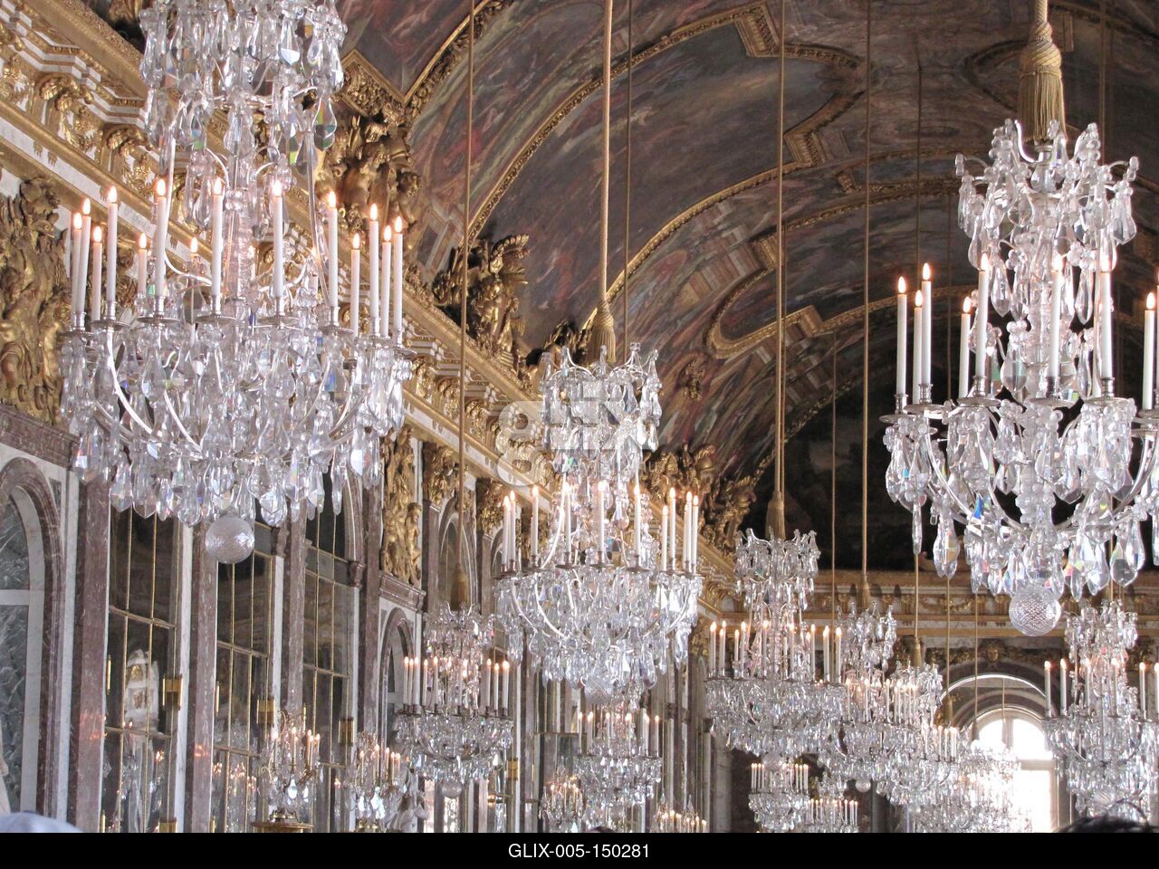 Versailles, 2015. április 10.A versaillesi királyi kastély üvegtermének (Galéries des Glaces) csillárjai. 1678-1684 között épült Jules Hardouin-Mansart tervei szerint. A 73 m hosszó, 10,5 m széles termet 17 ablak világítja meg, és 357 üvegtárgy ékesíti. Arra szolgált, hogy elkápráztassa a látogatót XIV. Lajos hatalmáról.