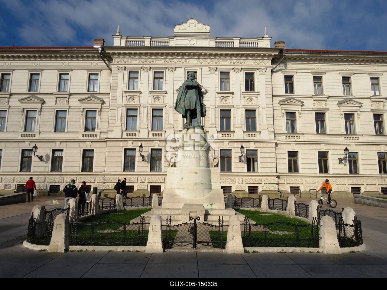 Pécs, 2018. november 17.Kossuth Lajos szobra a róla elnevezett téren. Mögötte az Irgalmas kórházat és okmányirodát magában foglaló tömb. A szobor Horvay János 1908-ban készült alkotása.