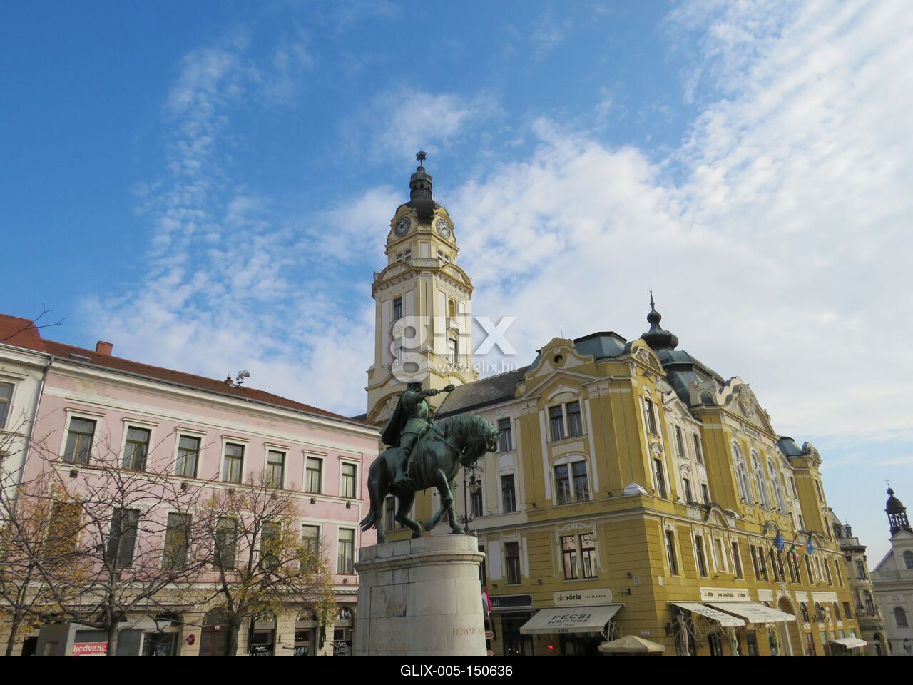 Pécs, 2018. november 17.Hunyadi János szobra a Széchenyi téren. Pátzay Pál alkotása (1956). Mögötte a Városháza. Lang Adolf tervei szerint épült a XX. sz-ban.