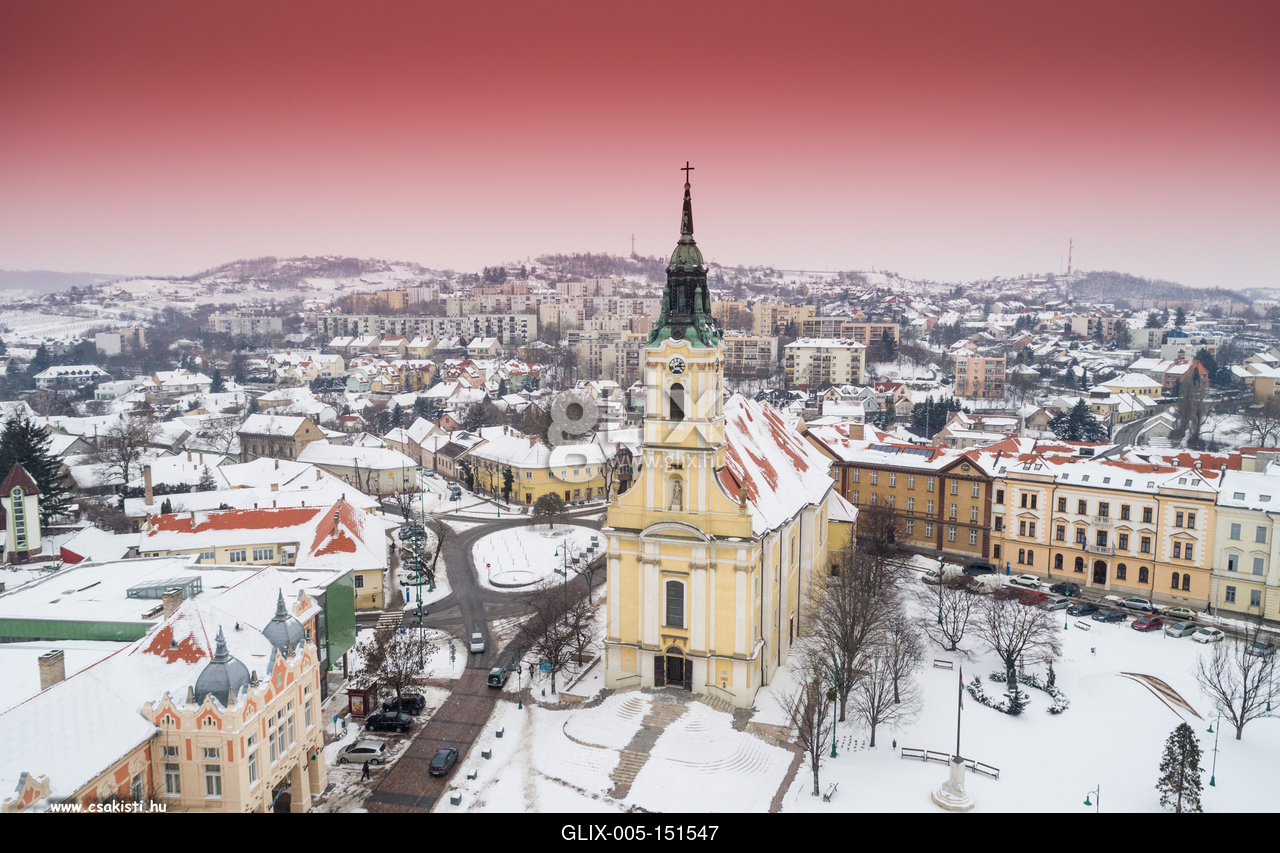 Szekszárd központja, a Béla Király tér a XIX. század elején épült Urunk mennybemenetele templommal.Bird eye view of Szekszard with church at winter