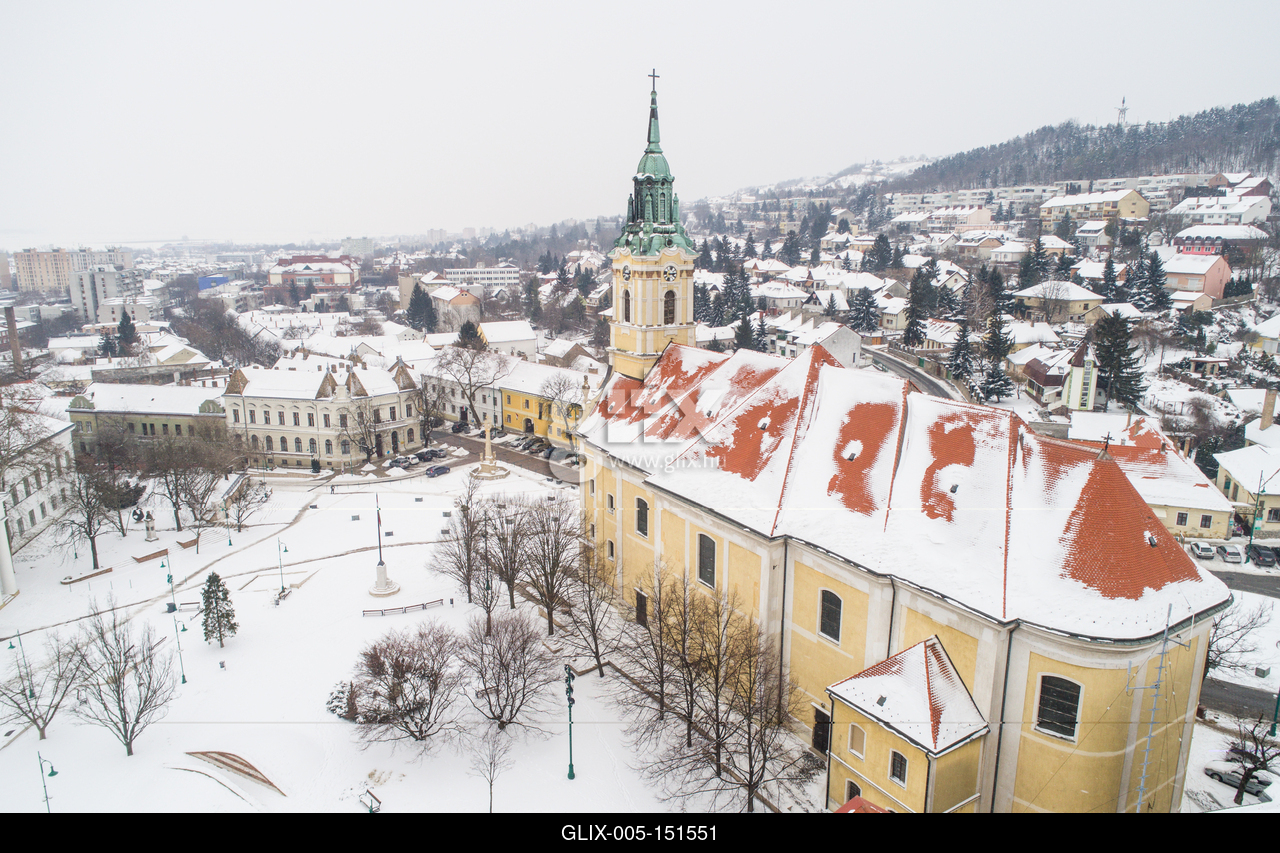 Szekszárd központja, a Béla Király tér a XIX. század elején épült Urunk mennybemenetele templommal.Bird eye view of Szekszard with church at winter
