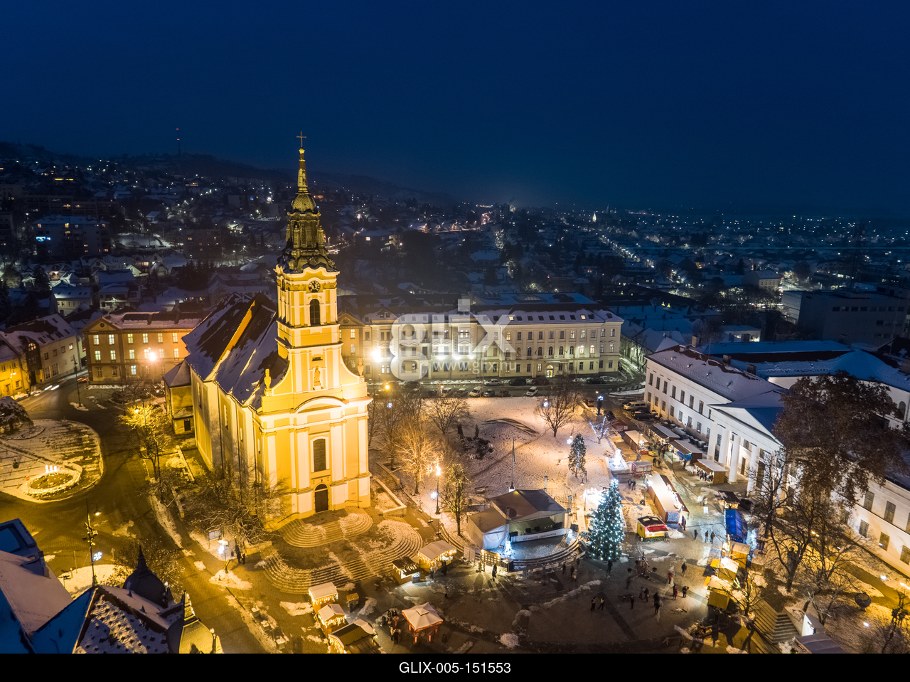 Szekszárd központja, a Béla Király tér a XIX. század elején épült Urunk mennybemenetele templommal.Bird eye view of Szekszard with church at winter