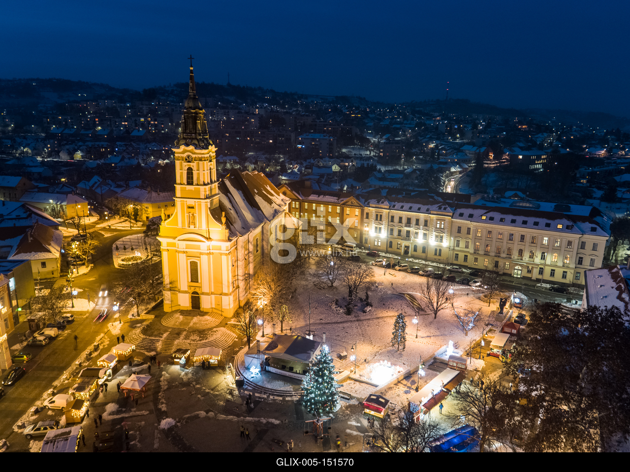 Szekszárd központja, a Béla Király tér a XIX. század elején épült Urunk mennybemenetele templommal.Bird eye view of Szekszard with church at winter