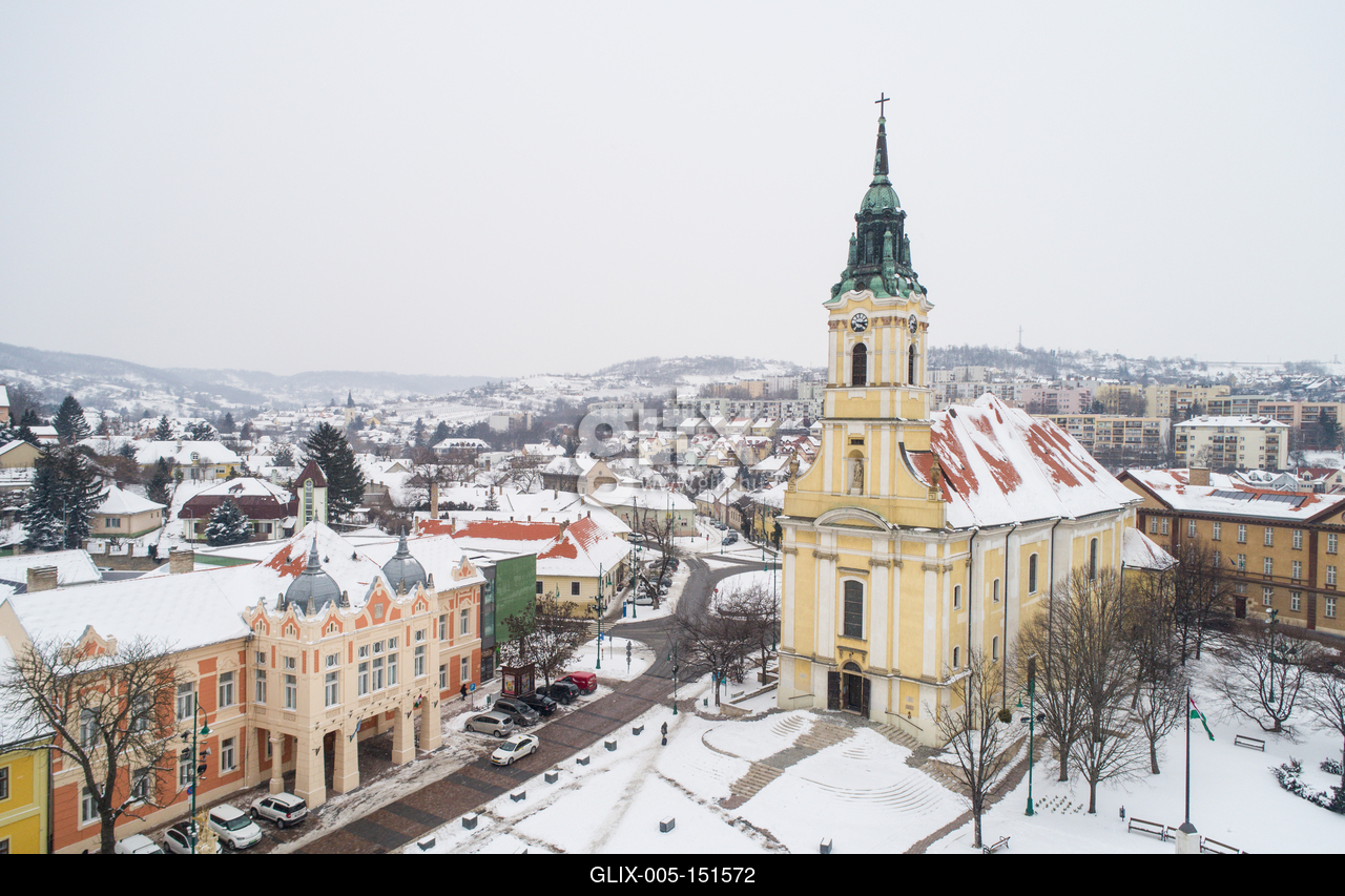 Szekszárd központja, a Béla Király tér a XIX. század elején épült Urunk mennybemenetele templommal.Bird eye view of Szekszard with church at winter