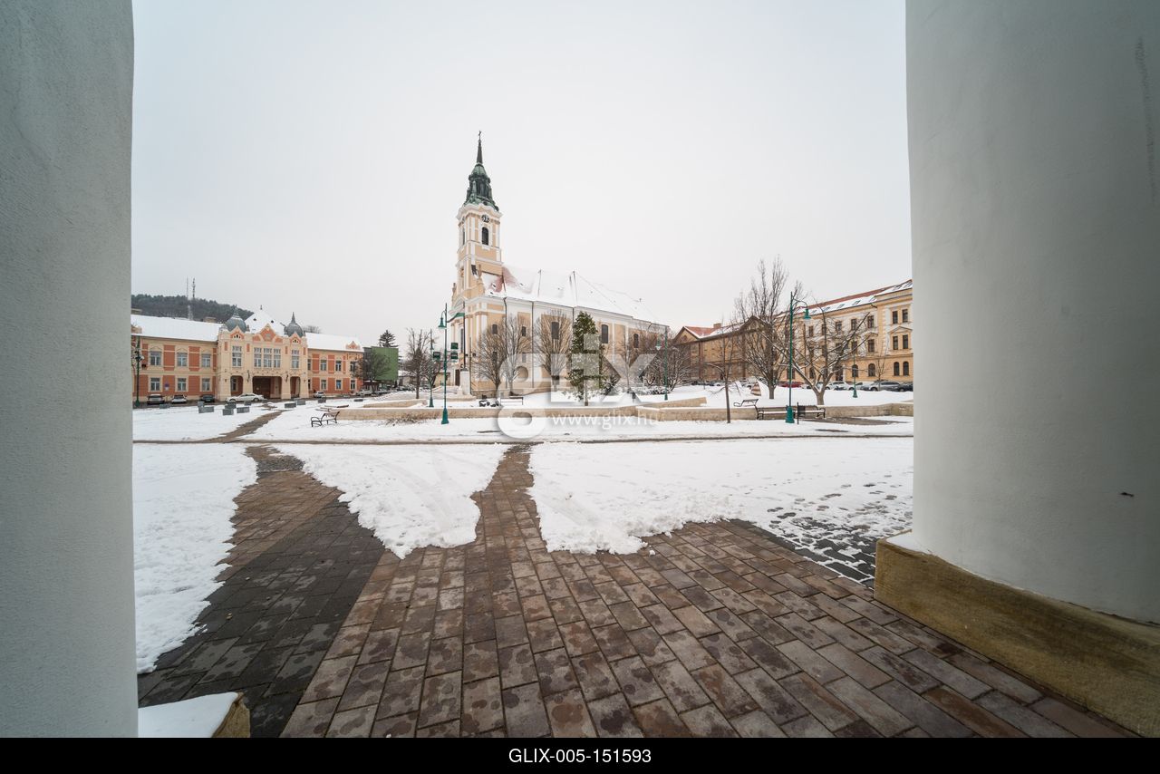 Szekszárd központja, a Béla Király tér a XIX. század elején épült Urunk mennybemenetele templommal.Bird eye view of Szekszard with church at winter