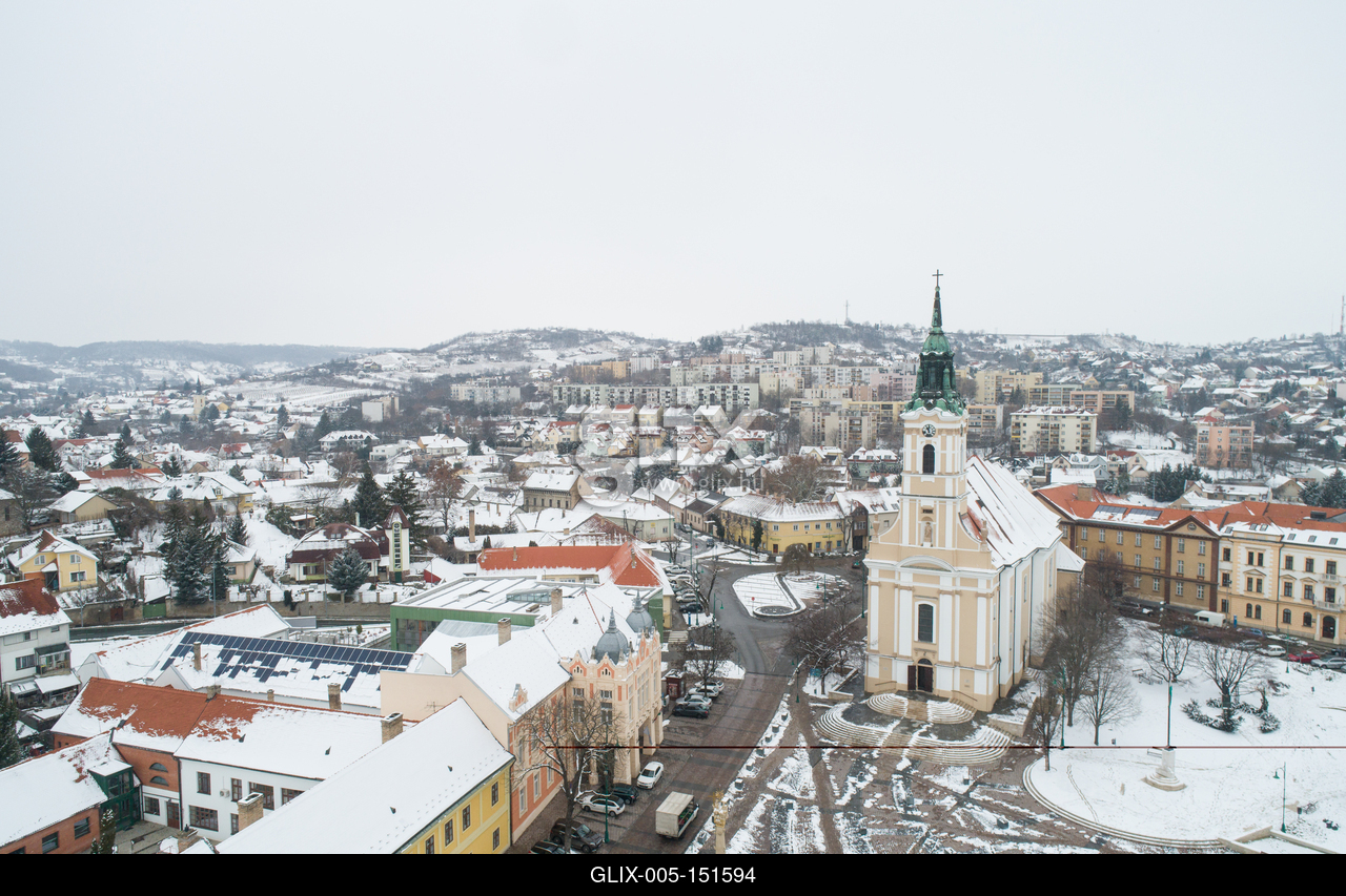 Szekszárd központja, a Béla Király tér a XIX. század elején épült Urunk mennybemenetele templommal.Bird eye view of Szekszard with church at winter