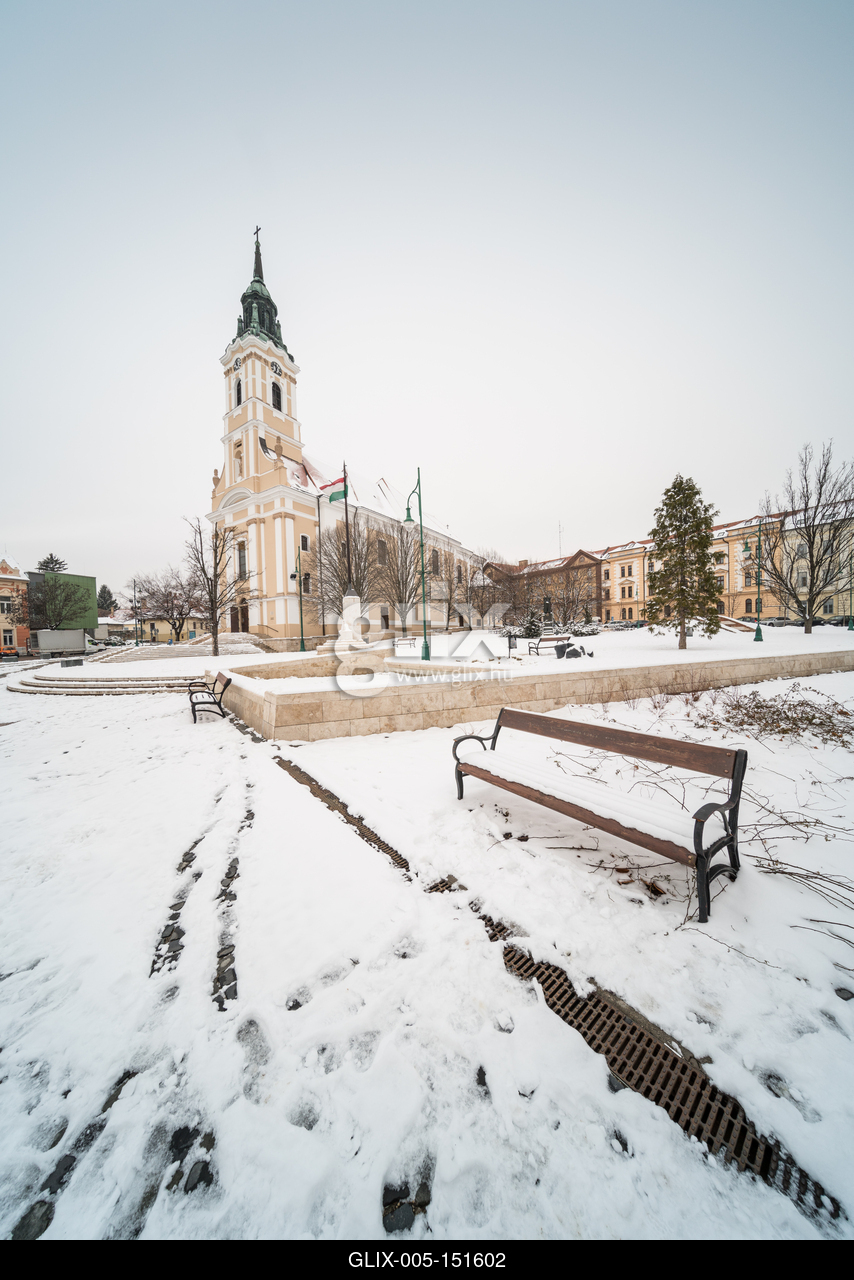 Szekszárd központja, a Béla Király tér a XIX. század elején épült Urunk mennybemenetele templommal.Bird eye view of Szekszard with church at winter