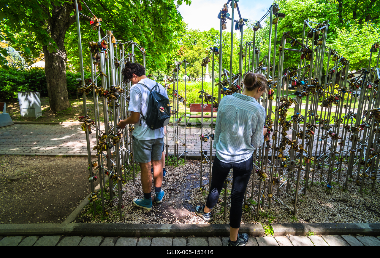 Fiatalok nézik a 2013-ban átadott új lakatfalat Pécs belvárosában, a Sétatéren. Magyarországon először Pécs belvárosában jelentek meg a szerelmesek lakatjai két egymáshoz közeli vaskerítésen.