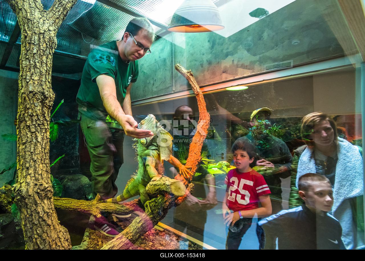 Az állatkert gondozója zöld leguánt (Iguana iguana) etet a pécsi állatkert terráriumában. A Pécsi Állatkert és Akvárium-Terrárium a Mecsek oldalában található állatkert.