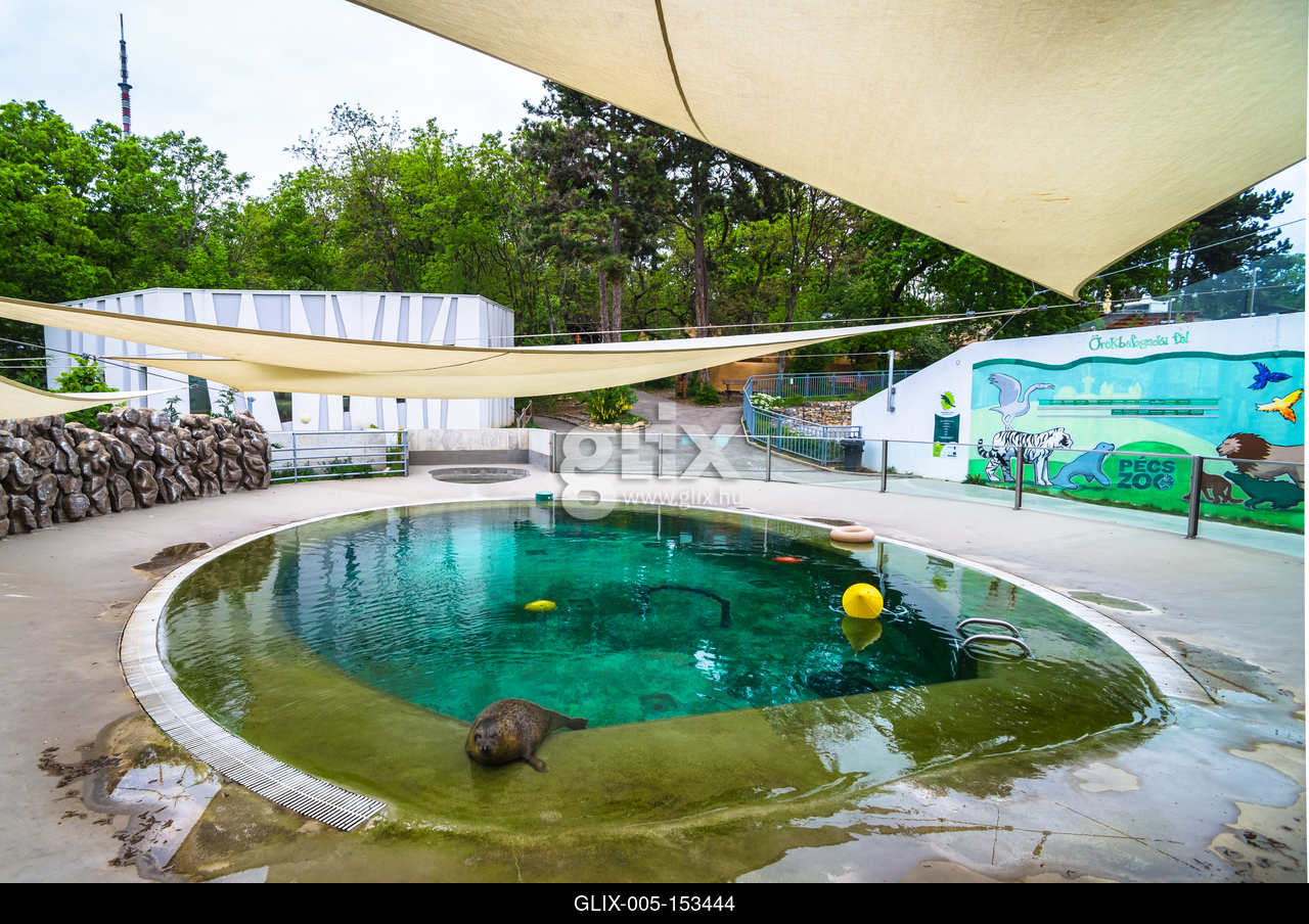 Fóka pihen a medence szélén a pécsi állatkertben.A Pécsi Állatkert és Akvárium-Terrárium a Mecsek oldalában található állatkert.