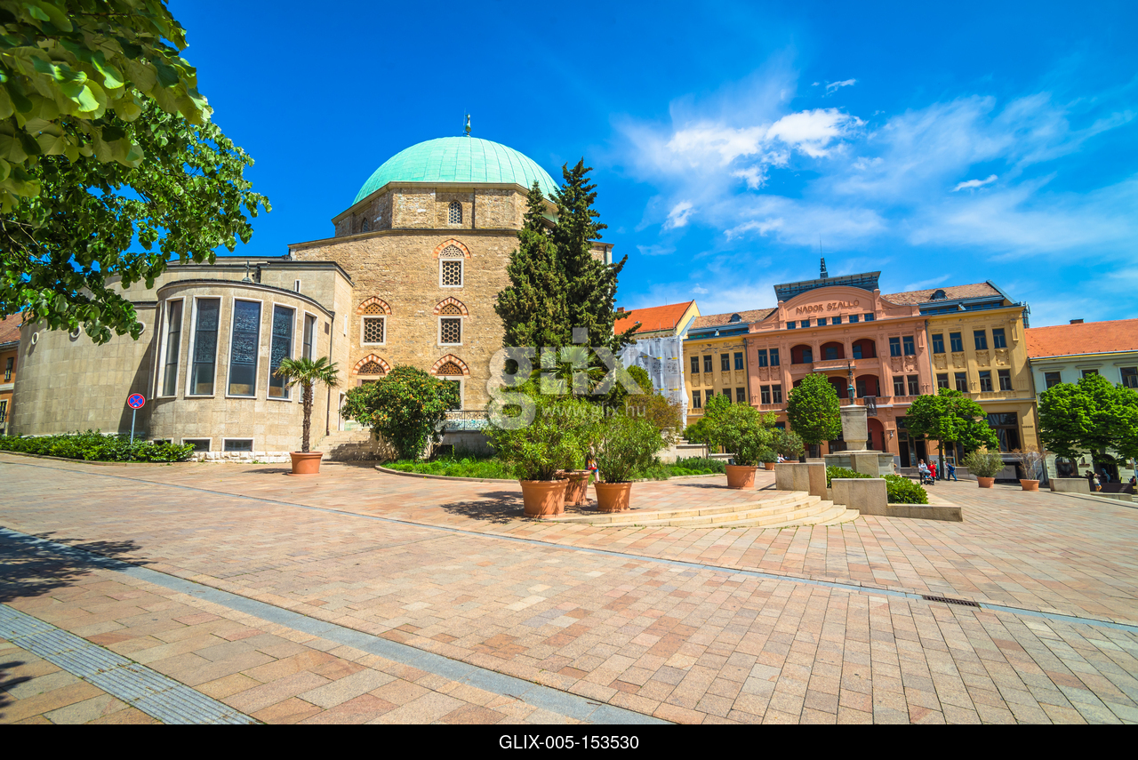 Pécs belvárosa, a Széchenyi tér, amely a város főtere.A képen balra a Gázi Kászim Pasa dzsámija (belvárosi templom) és a Nádor Szálló épülete.
