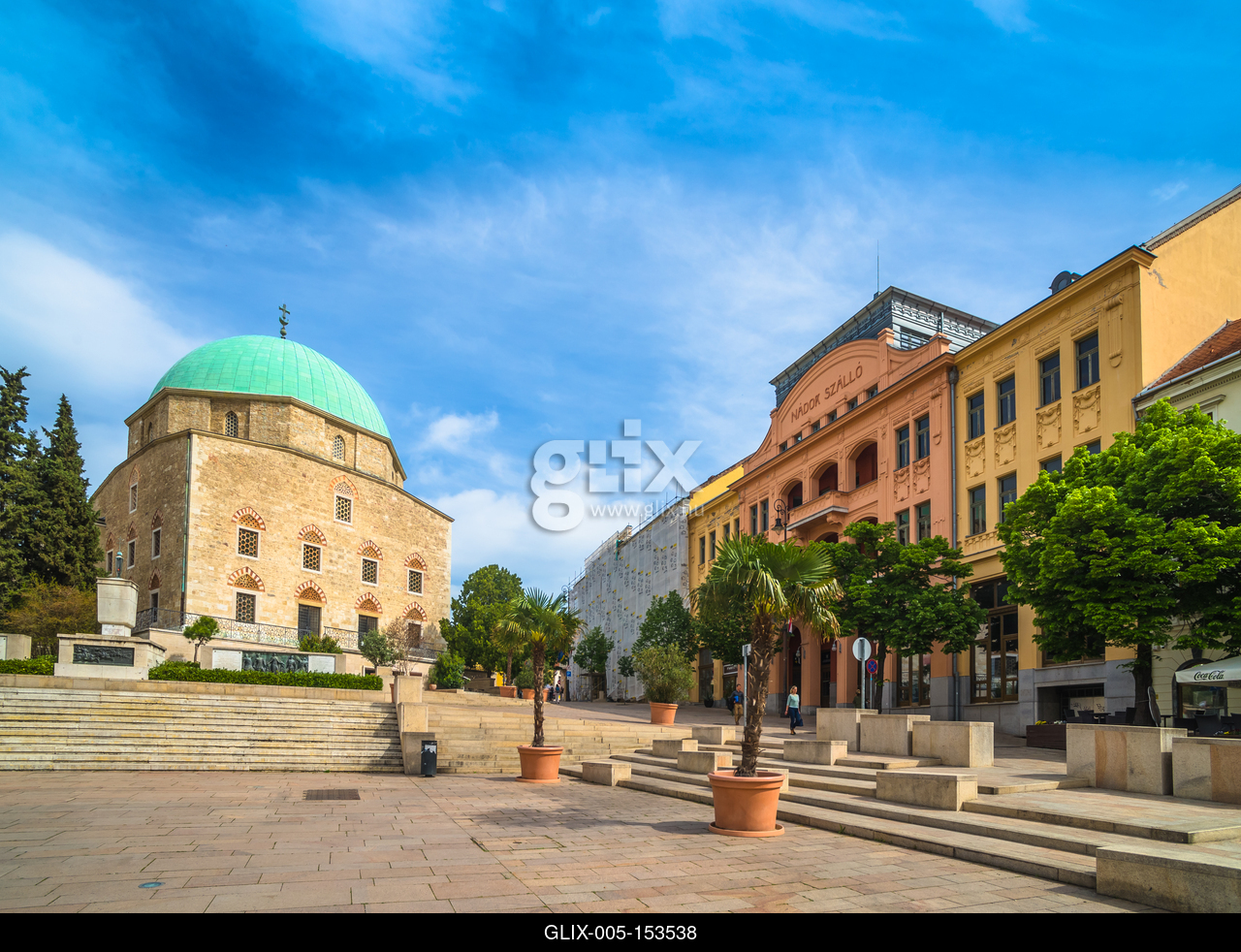 Pécs belvárosa, a Széchenyi tér, amely a város főtere.A képen Gázi Kászim Pasa dzsámija (belvárosi templom) és a Nádor Szálló épülete.