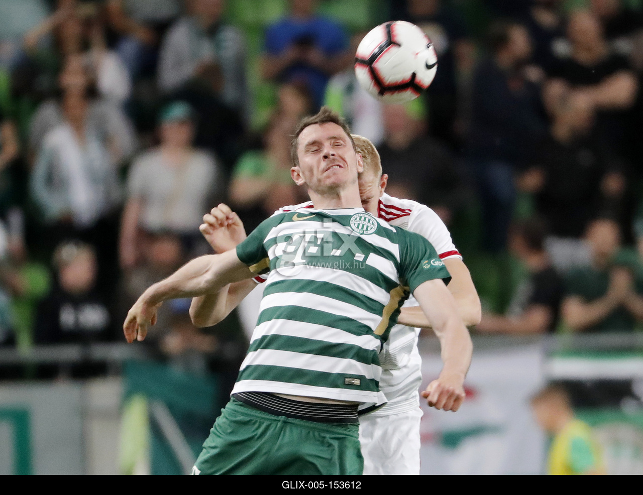 BUDAPEST, HUNGARY - MAY 11: (l-r) Nikolai Signevich of Ferencvarosi TC battles for the ball in the air with Csaba Szatmari of DVSC during the Hungarian OTP Bank Liga match between Ferencvarosi TC and DVSC at Groupama Arena on May 11, 2019 in Budapest, Hungary.