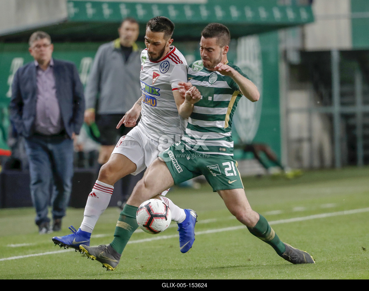 BUDAPEST, HUNGARY - MAY 11: (r-l) Endre Botka of Ferencvarosi TC challenges Mark Szecsi of DVSC during the Hungarian OTP Bank Liga match between Ferencvarosi TC and DVSC at Groupama Arena on May 11, 2019 in Budapest, Hungary.