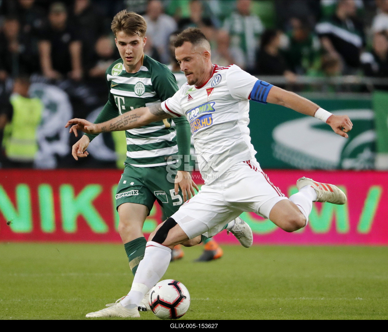 BUDAPEST, HUNGARY - MAY 11: (r-l) Daniel Tozser of DVSC kicks the ball before Andras Csonka of Ferencvarosi TC during the Hungarian OTP Bank Liga match between Ferencvarosi TC and DVSC at Groupama Arena on May 11, 2019 in Budapest, Hungary.