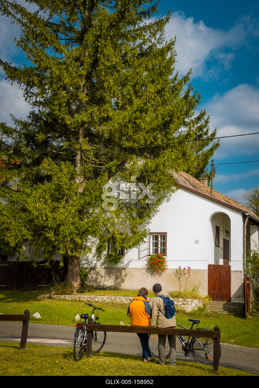 Kerékpáros turisták pihennek Vérteskozma főutcáján.A Fejér megyei Gánthoz tartozó Vérteskozma egy meseszép zsákfalu. A település nevezetessége a 19. századi, hófehér német parasztházak sora, melyekhez szépen ápolt kertek is tartoznak.