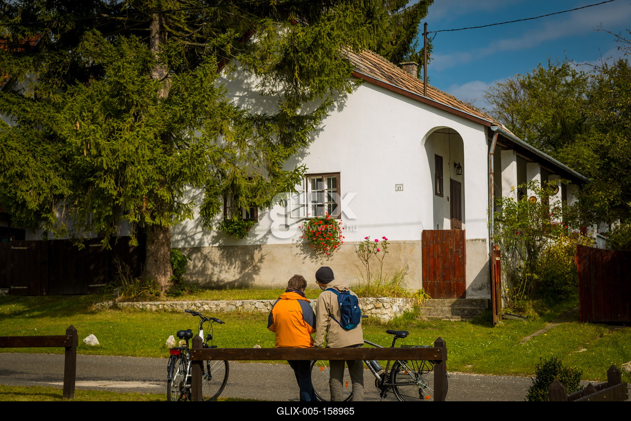 Kerékpáros turisták pihennek Vérteskozma főutcáján.A Fejér megyei Gánthoz tartozó Vérteskozma egy meseszép zsákfalu. A település nevezetessége a 19. századi, hófehér német parasztházak sora, melyekhez szépen ápolt kertek is tartoznak.