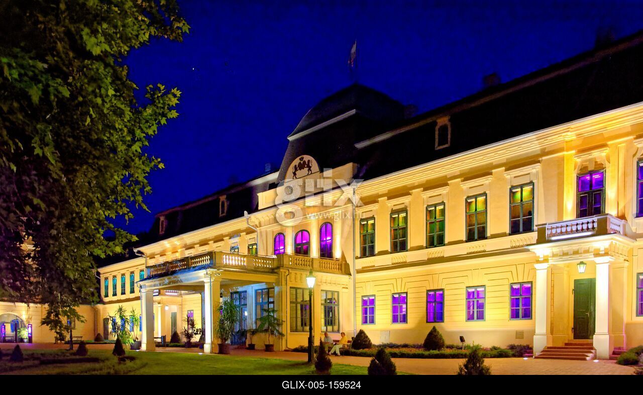 A Gyulai Almásy kastély Látogatóközpont esti fényben oldalnézet