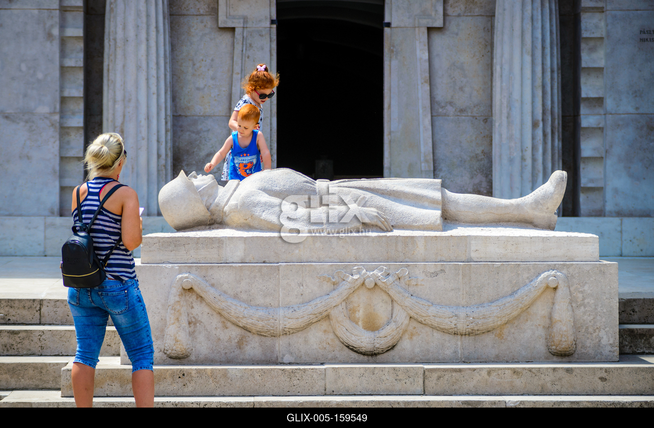 Turisták Székesfehérvár belvárosában a Hősők terén, az I. világháborús emlékműnél