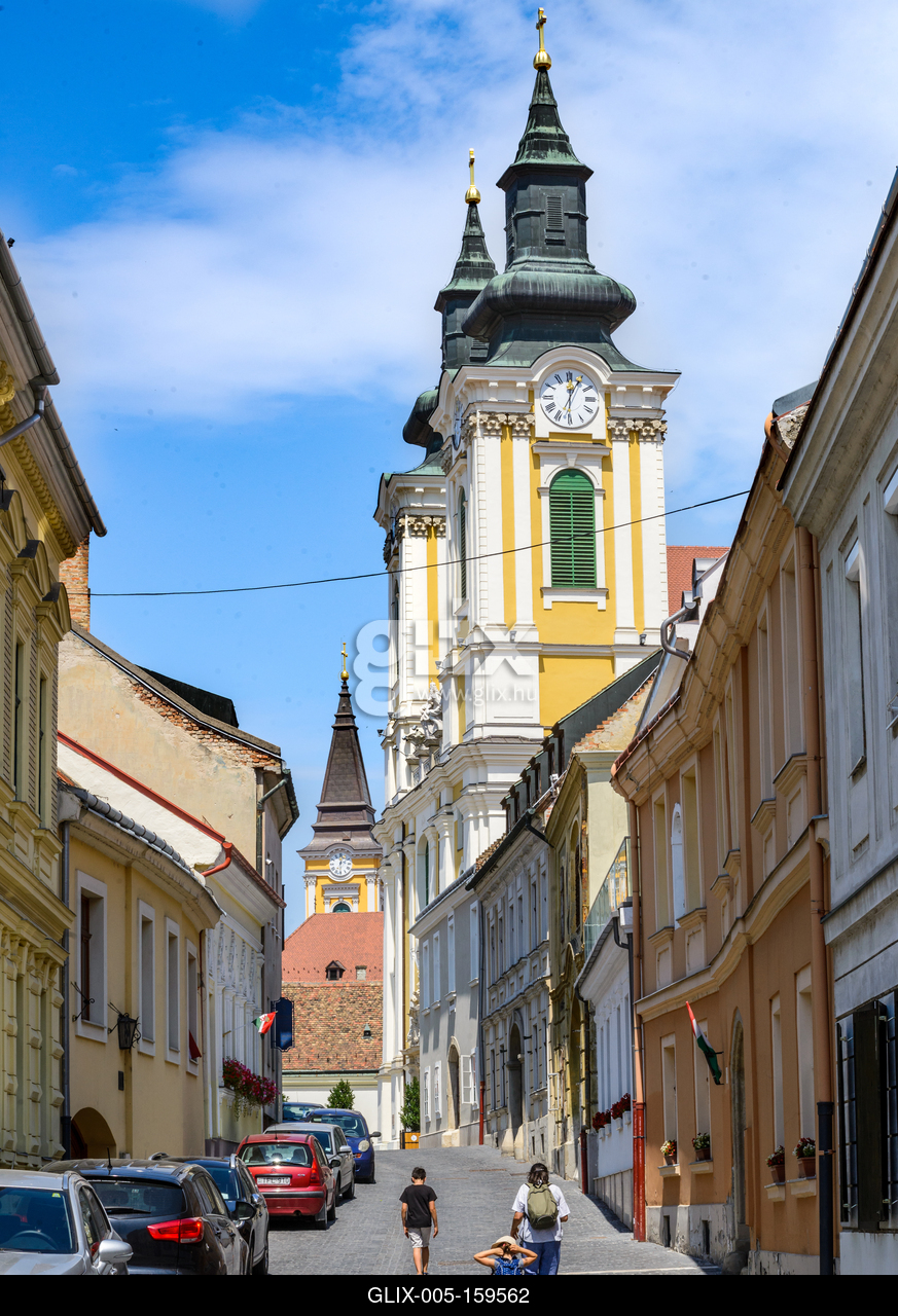 Székesfehérvár, az Arany János utca a belvárosban, hátérben a székesfehérvári Szent István-székesegyház tornya