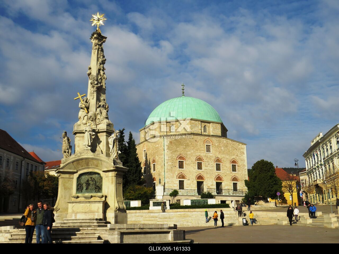 Pécs, 2018. november 17.Gázi Kaszim pasa dzsámija (XVI. sz.) és a szentháromság szobor a Széchenyi téren.