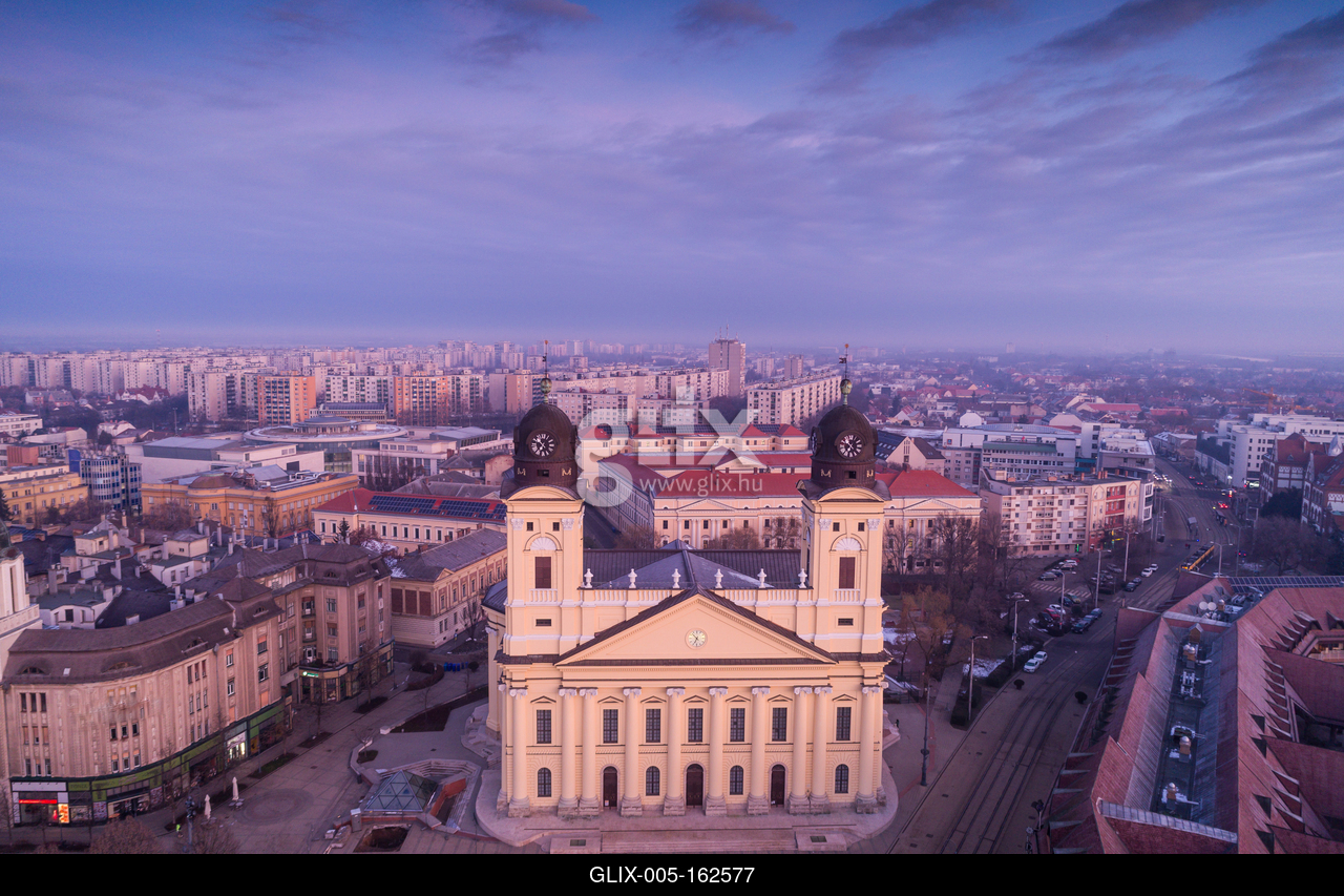 Aerial photo of Reformed Great Church in Debrecen city, Hungary