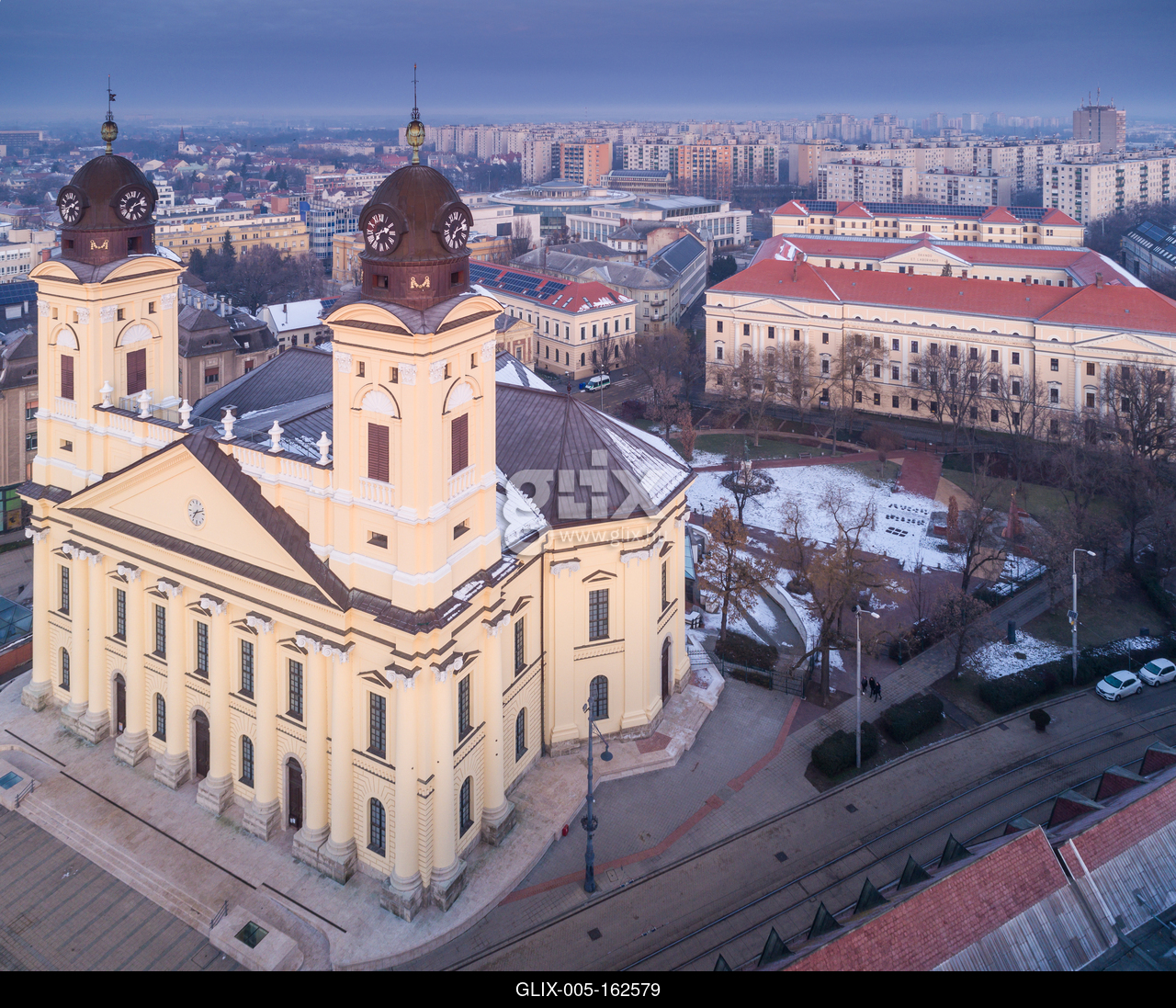 Aerial photo of Reformed Great Church in Debrecen city, Hungary