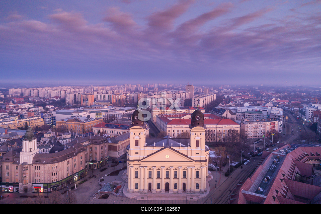 Aerial photo of Reformed Great Church in Debrecen city, Hungary