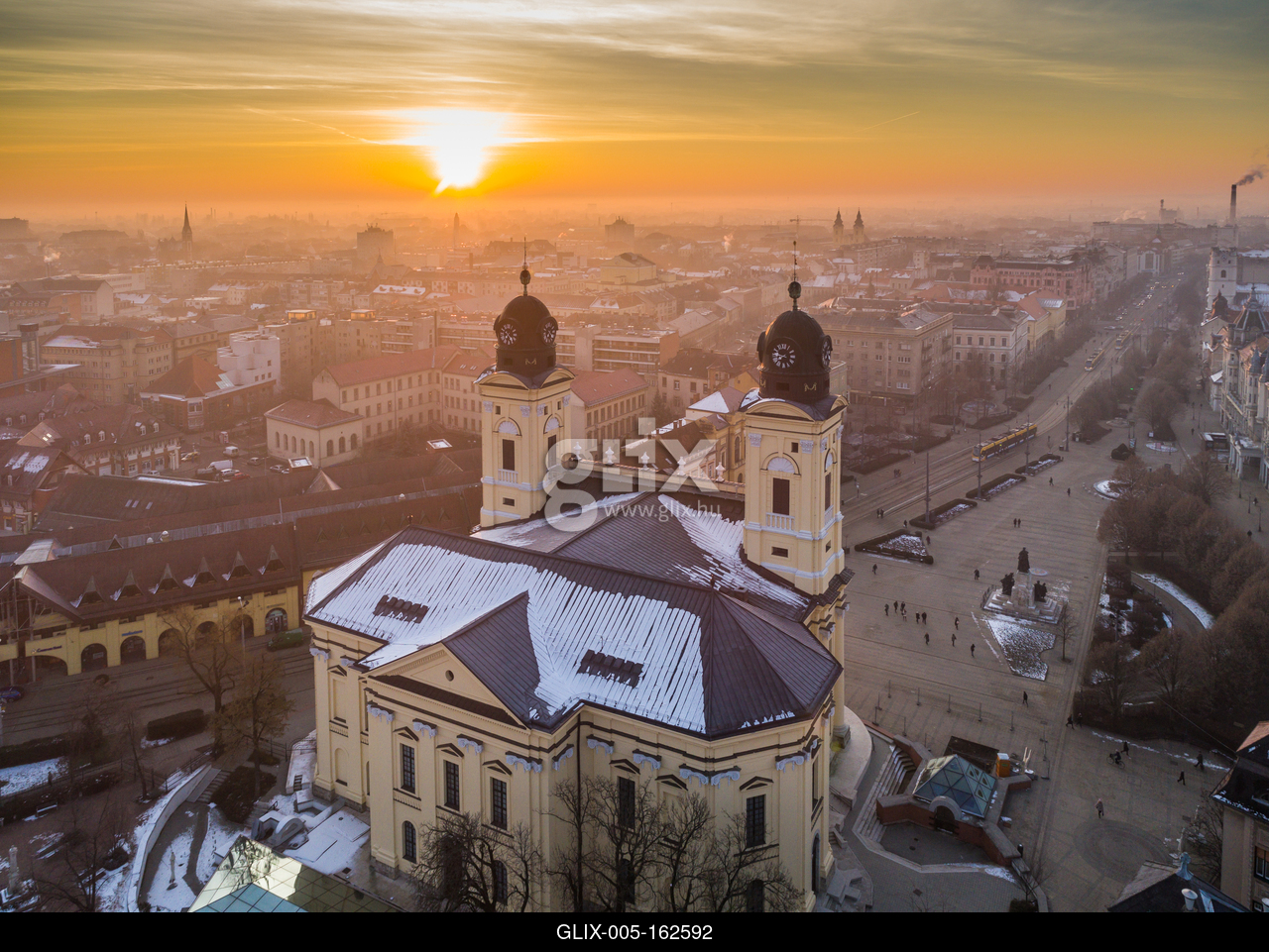 Aerial photo of Reformed Great Church in Debrecen city, Hungary