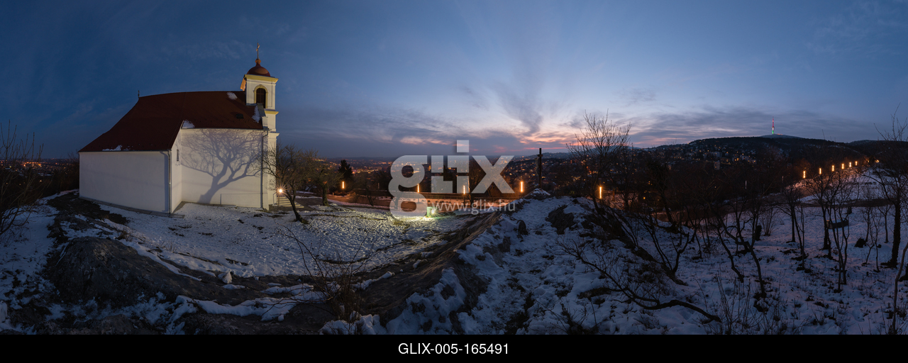 Winter panorama in Pécs, the county seat of Baranya. On the left side is Havihegy church, on the right side is the tv tower with floodlight.
