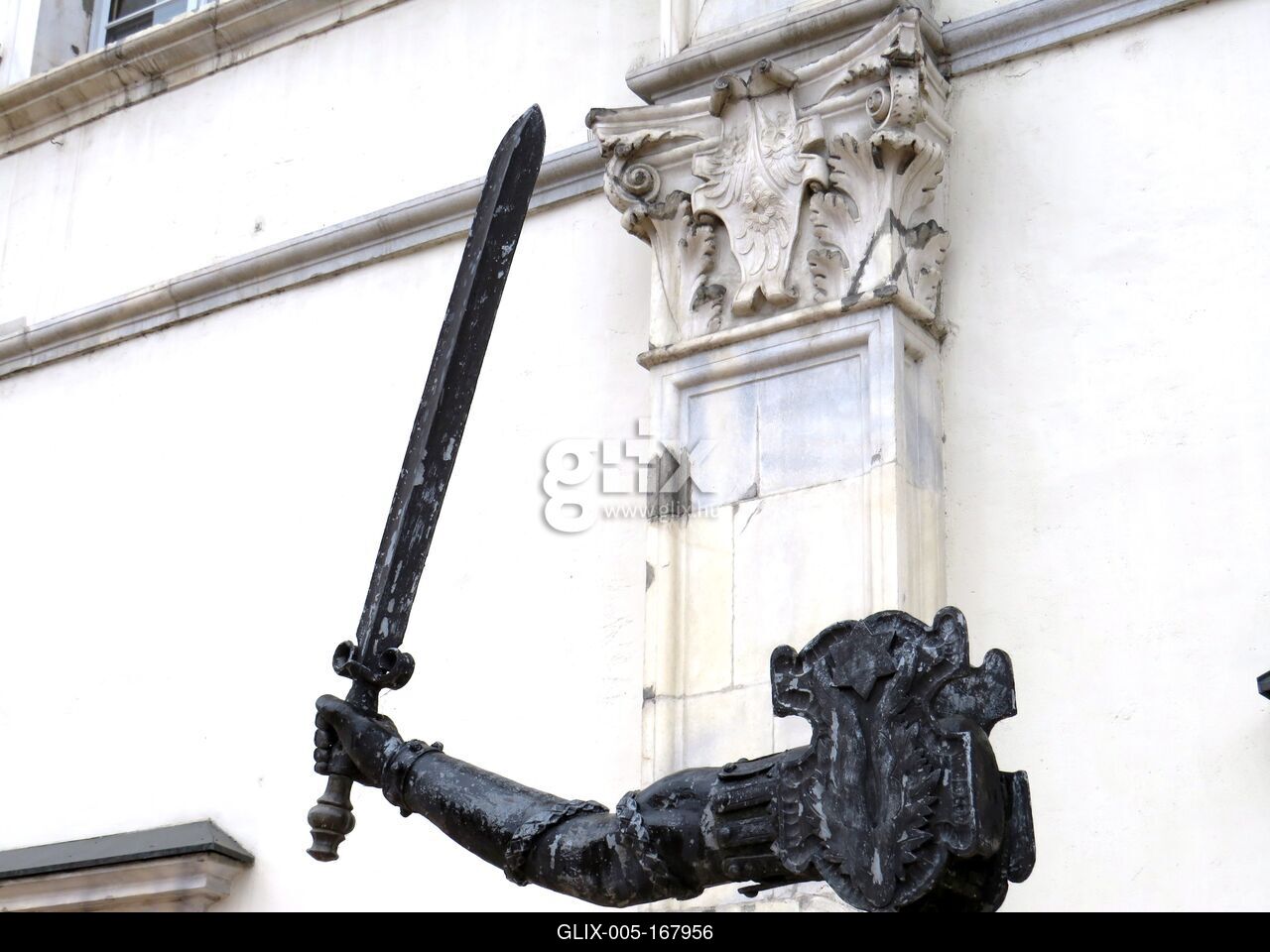Spittal (Ausztria), 2020. július 16.Hand grabbing sword. It is a decorative element from the 16th C. of the columnar column in front of Porcia Castle.Kardot markoló kar szobor. A Porcia kastély előtt álló pellengér oszlop díszitő eleme.XVI. sz.