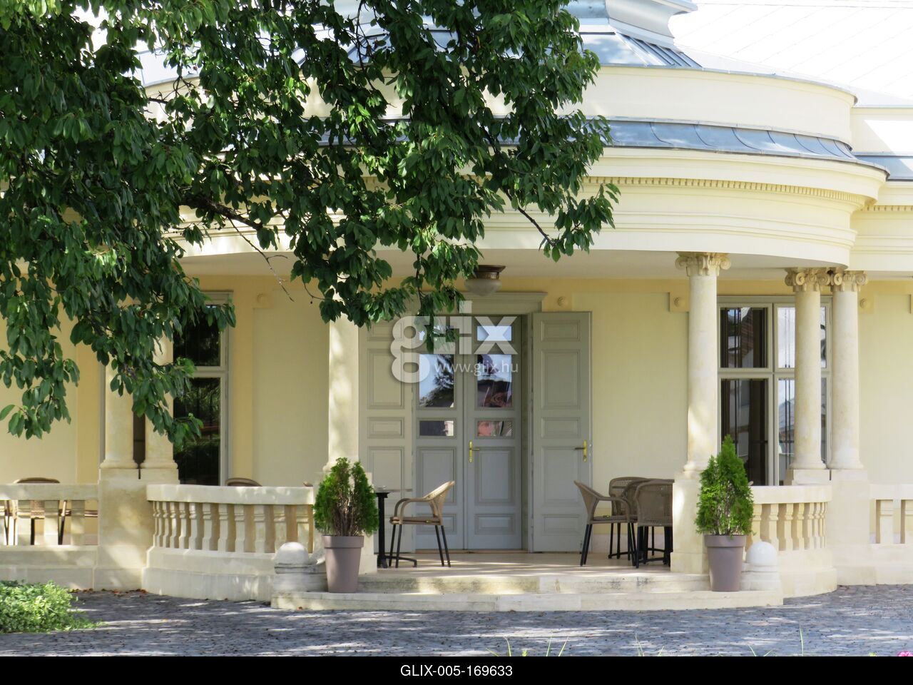 Kápolnásnyék, 020. szeptember 19.The park-side terrace of the castle of Halásaz family of Dabas, restored in 2016, in Káplnásnyék.The Castle was built in 1910.A dabasi Halász család 2016-ban restaurált kastélyának park felőli terasza Káplnásnyéken. A kastély 1910-ben épült.