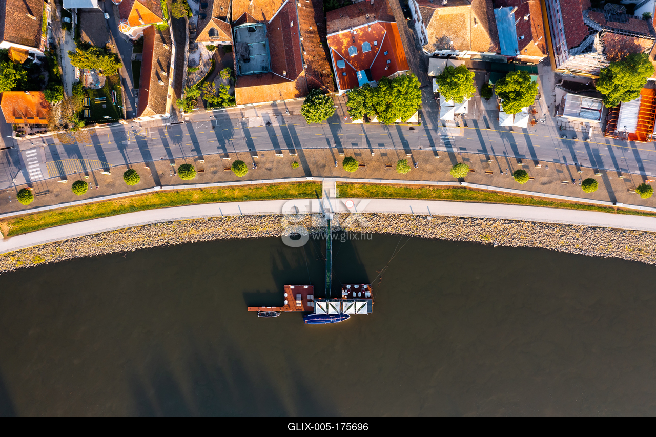 Top down view about a part of Szentendre city in Hungary. Amazing aerial shot of the church. Famous tourist attraction is the Danube riverside walkway.