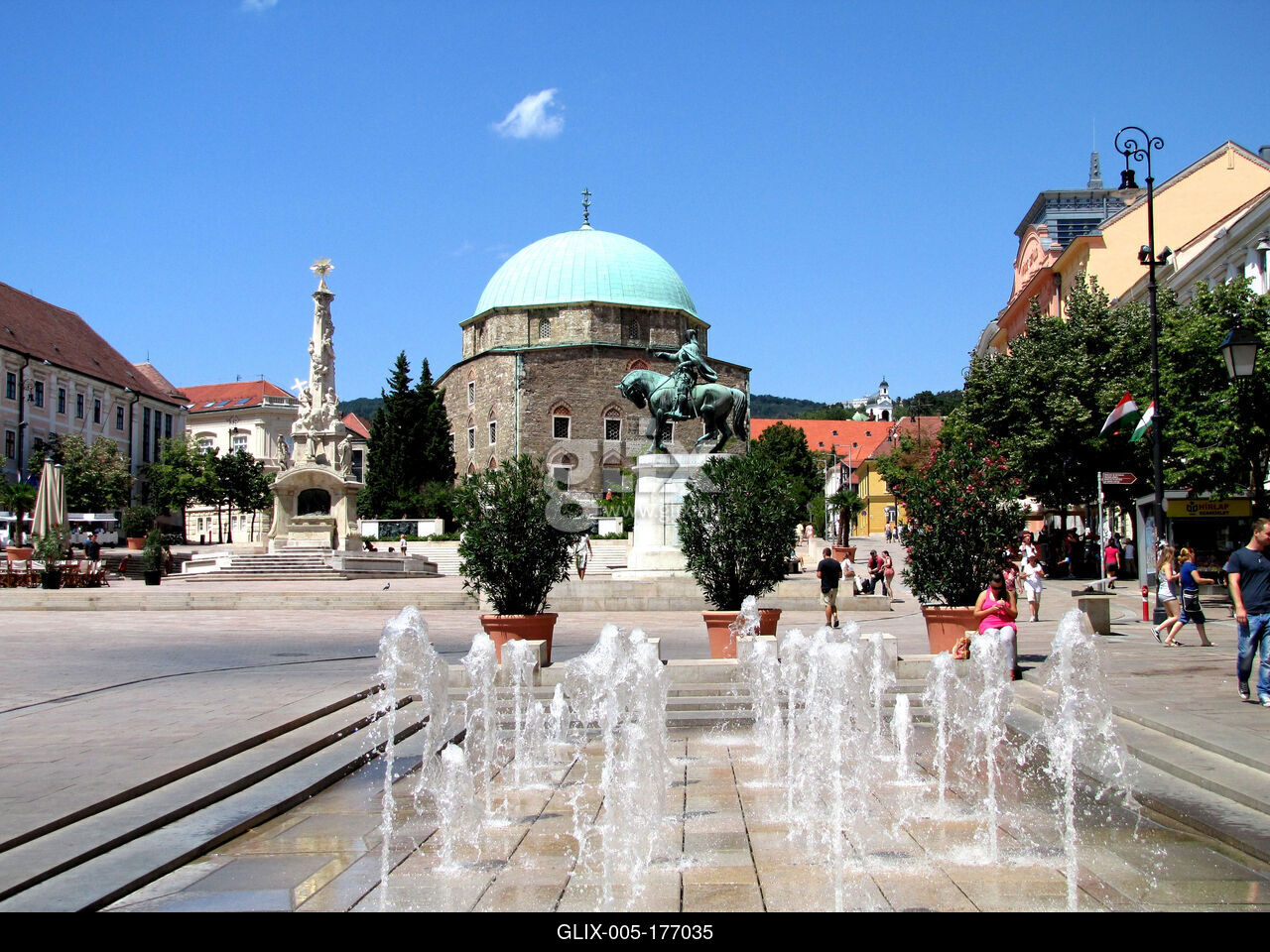 Pécs, 2012. július 22.Széchenyi Square with a fountain.A Széchenyi tér szökőkúttal.