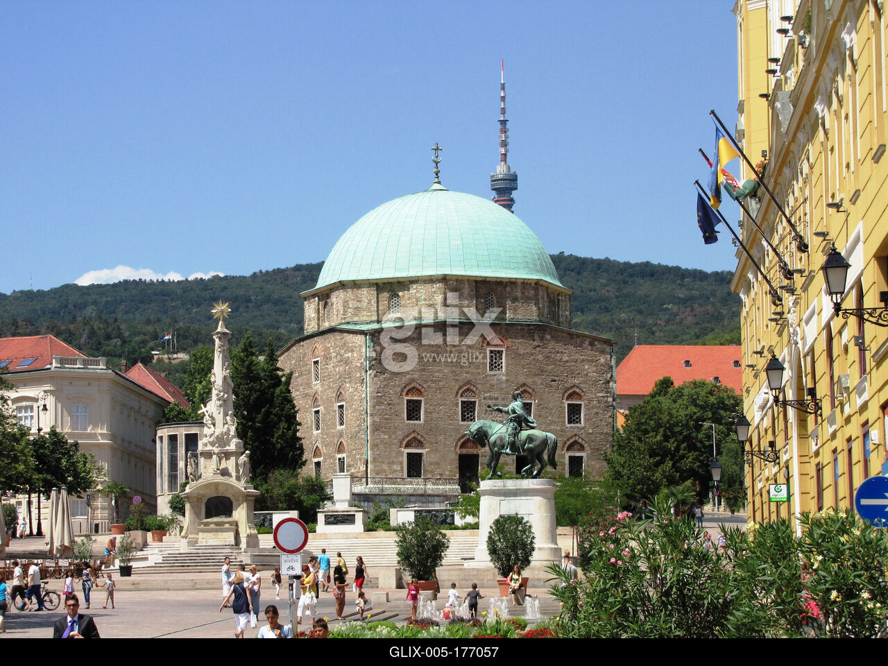 Pécs, 2009. július 22.Széchenyi Square with the Mosque, to the right is the yellow building of the town hall.A Széchenyi tér a Dzsámival, jobbra a városháza sárga épülete.