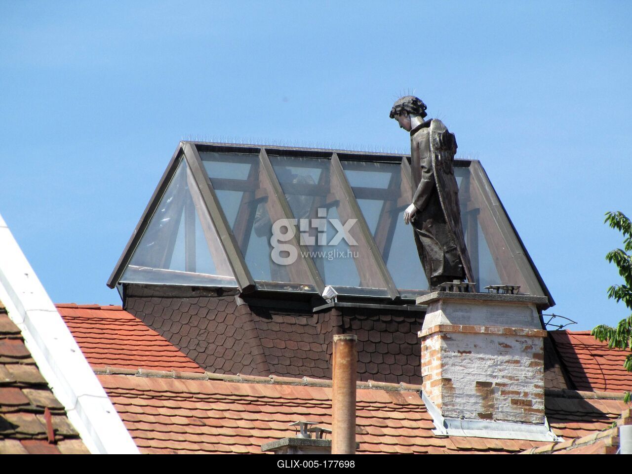 Győr, 2015. június 6.Statue of an angel on the top of the Makovecz chapel of the Benedictine grammar school in Győr. The work of László Péterfy from 1995. There are two statues of angels on the roof, the contour of the other emerging from the other side of the glass roof. The interesting thing about the sculptures is that one angel’s face and hands are gold while the other is silver. The interesting thing about the sculptures is that one angel’s face and hands are gold while the other is silver. According to Makovecz’s plan, “The eye raised to heaven sees two angels, the guards of the gates of Heaven. With their wings folded, their coats fluttered by the celestial wind, and between them, high above all our hopes. ”Angyalszobor a győri bencés gimnázium Makovecz kápolnájának tetején. Péterfy László alkotása 1995-ből. A tetőn két angyalszobor áll, a másik konturja az üvegtető túloldalán sejlik föl. A szobrok érdekessége, hogy az egyik angyal arca és keze arany, míg a másiké ezüst. A szobrok érdekessége, hogy az egyik angyal arca és keze arany, míg a másiké ezüst. Makovecz terve szerint „Az égre emelt szem két angyalt lát, az Ég kapujának őreit. Szárnyuk összecsukva, kabátjukat meglebbenti az égi szél, s közöttük, fenn a magasban minden reményünk.”