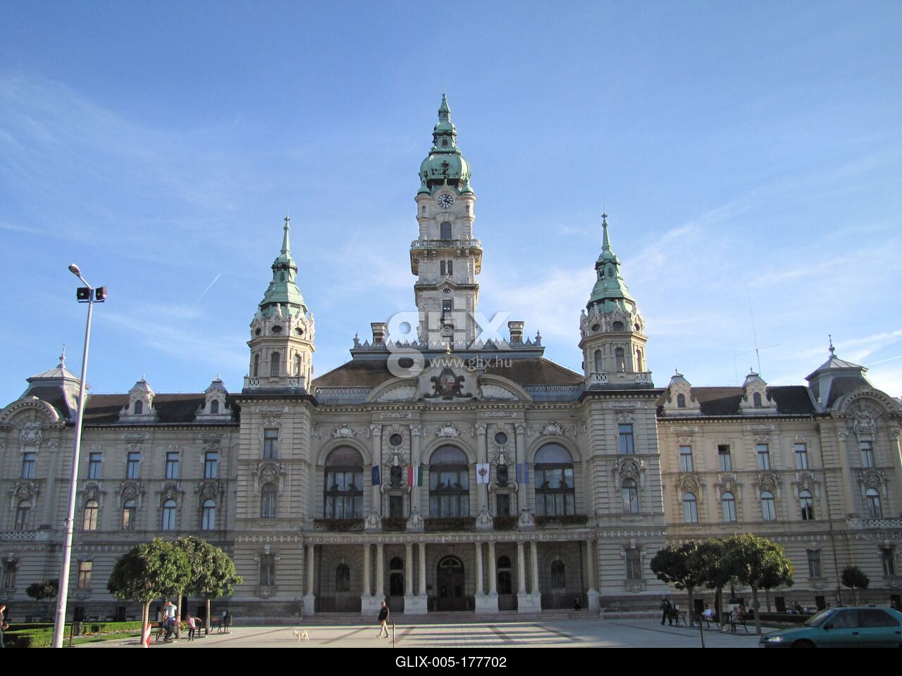 Győr, 2014. október 19.The Town Hall of Győr. It is 85 meters long, 40 meters wide, and the tower is 59 meters high. It was built according to the plans of Jenő Hübner between 1896-1900.A győri városháza. Hosszúsága 85 méter hosszú, 40 méter széles, a torony magassága 59 méter. Hübner Jenő tervei szerint épült 1896-1900 között.