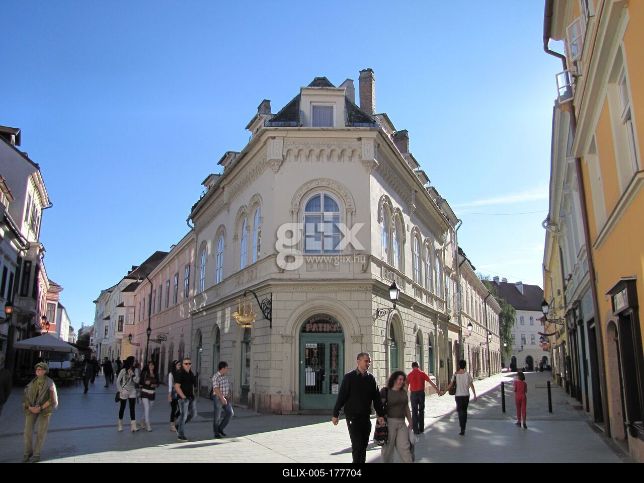 Győr, 2014. október 19.Jedlik Ányos utca (left) and Kovács Pál utca (right). Opposite the Golden Ship Pharmacy.A Jedlik Ányos utca (balra) és a Kovács Pál utca (jobbra). Szemben az Aranyhajó patika.