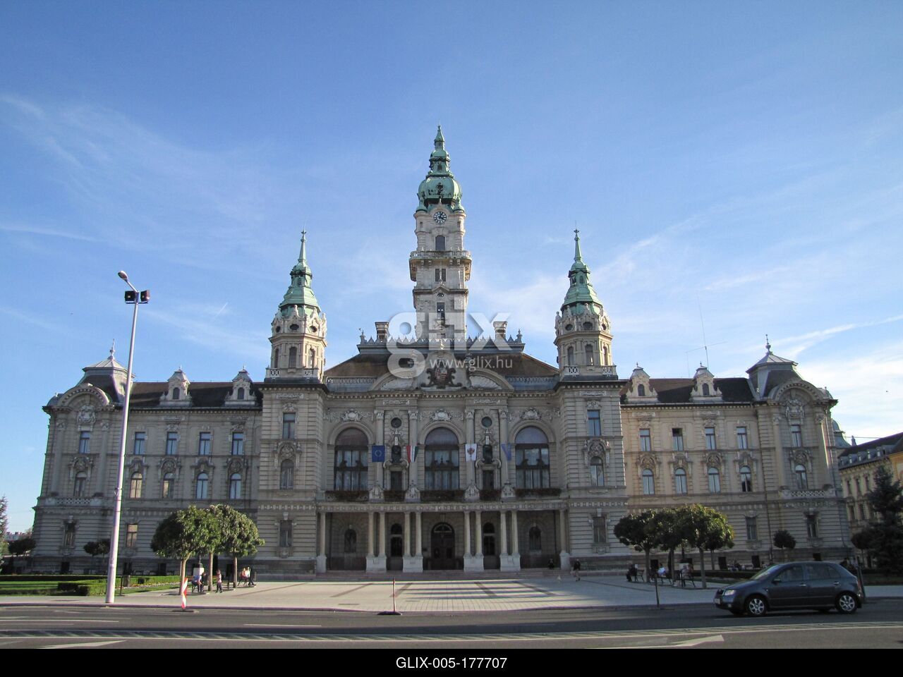 Győr, 2014. október 19.The Town Hall of Győr. It is 85 meters long, 40 meters wide, and the tower is 59 meters high. It was built according to the plans of Jenő Hübner between 1896-1900.A győri városháza. Hosszúsága 85 méter hosszú, 40 méter széles, a torony magassága 59 méter. Hübner Jenő tervei szerint épült 1896-1900 között.