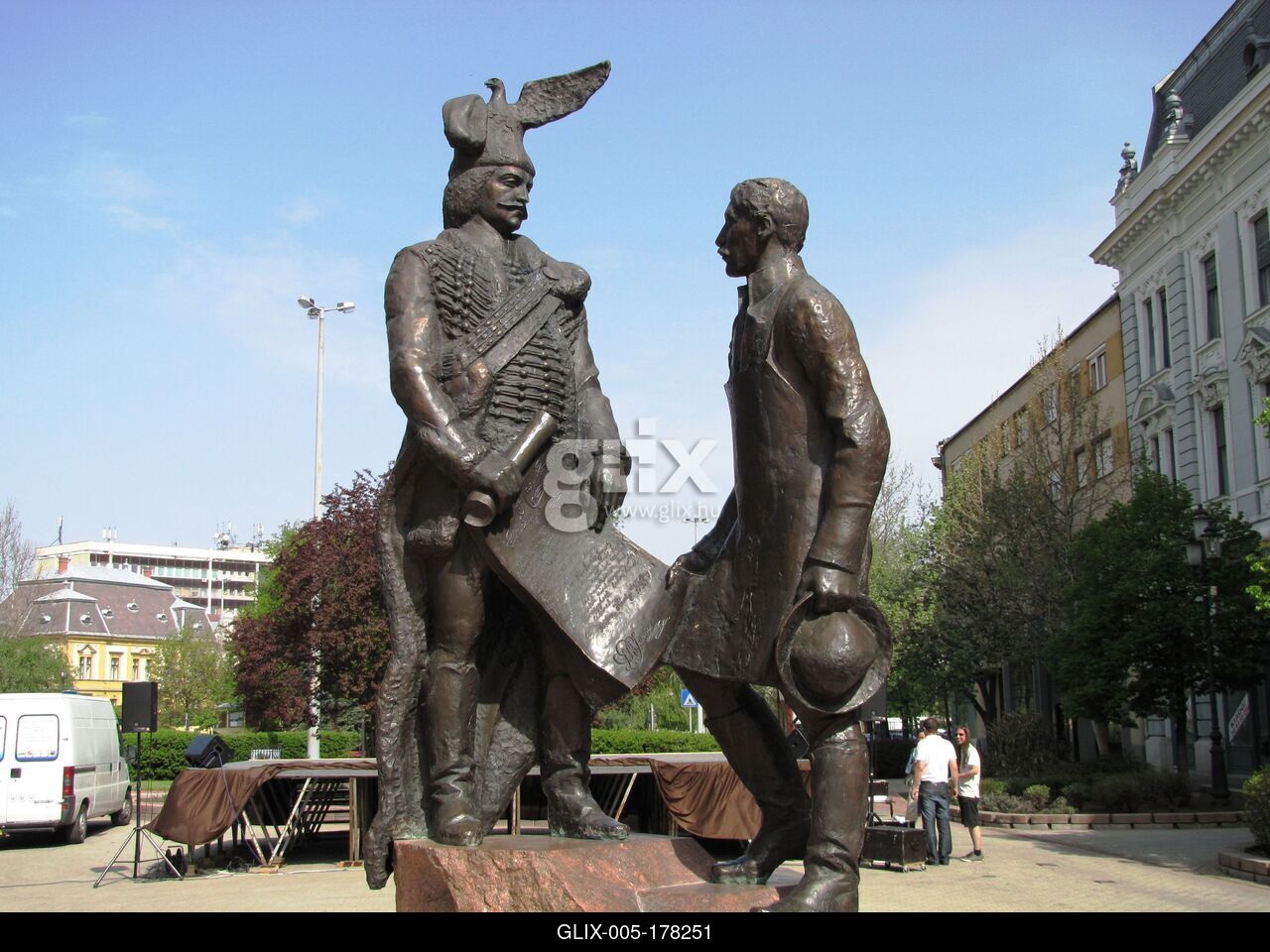 Nyíregyháza, 2013. április 27.Statue of the Founding Fathers. Count Ferenc Károlyi and János Petrikovics are depicted in the year of the city's founding, 1753. Benedek Nagy's work was made in 2001.A Városalapító atyák szobra. Gróf Károlyi Ferencet és Petrikovics Jánost ábrázolja a város megalapításának évében, 1753-ban. Nagy Benedek 2001-ben készült alkotása.