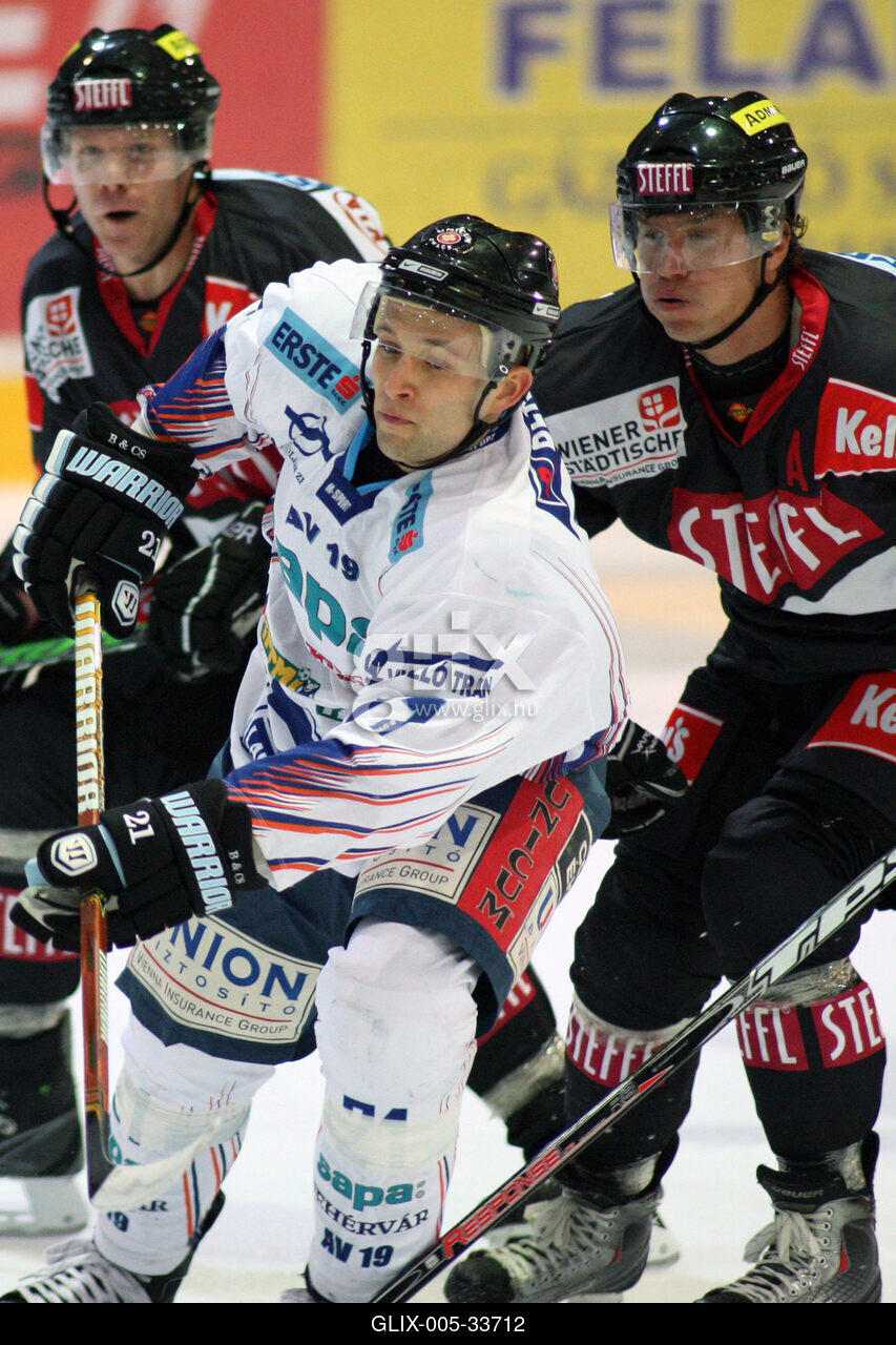 A képen: Kovács Csaba (HUN), a Sapa Fehérvár AV19 játékosa küzd a korongért, hátrébb Jeremy Rebek, Marcel Rodman (AUT).