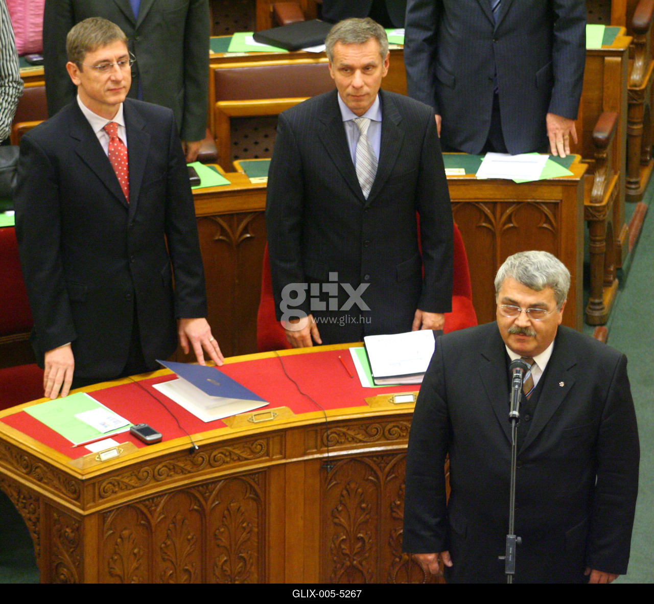 A képen: képviselői esküjét teszi le Tasnádi Péter (jobbra), Pécs szocialista polgármestere. Balra Gyurcsány Ferenc, középen Szilvásy György
