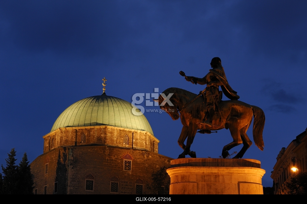 Esti fényben a felújított Széchenyi tér Pécsen, a dzsámival és Hunyadi János szoborral.