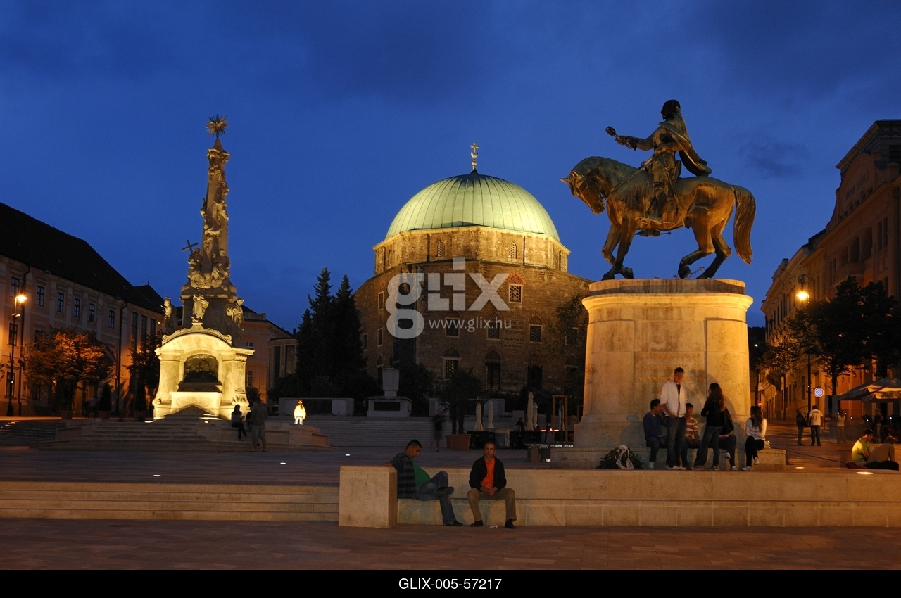 Esti fényben a felújított Széchenyi tér Pécsen, a Szentháromság szoborral, a dzsámival és Hunyadi János szoborral.