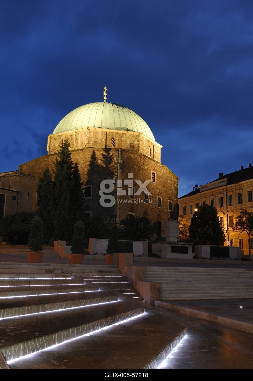 Esti fényben a felújított Széchenyi tér Pécsen, a dzsámival.