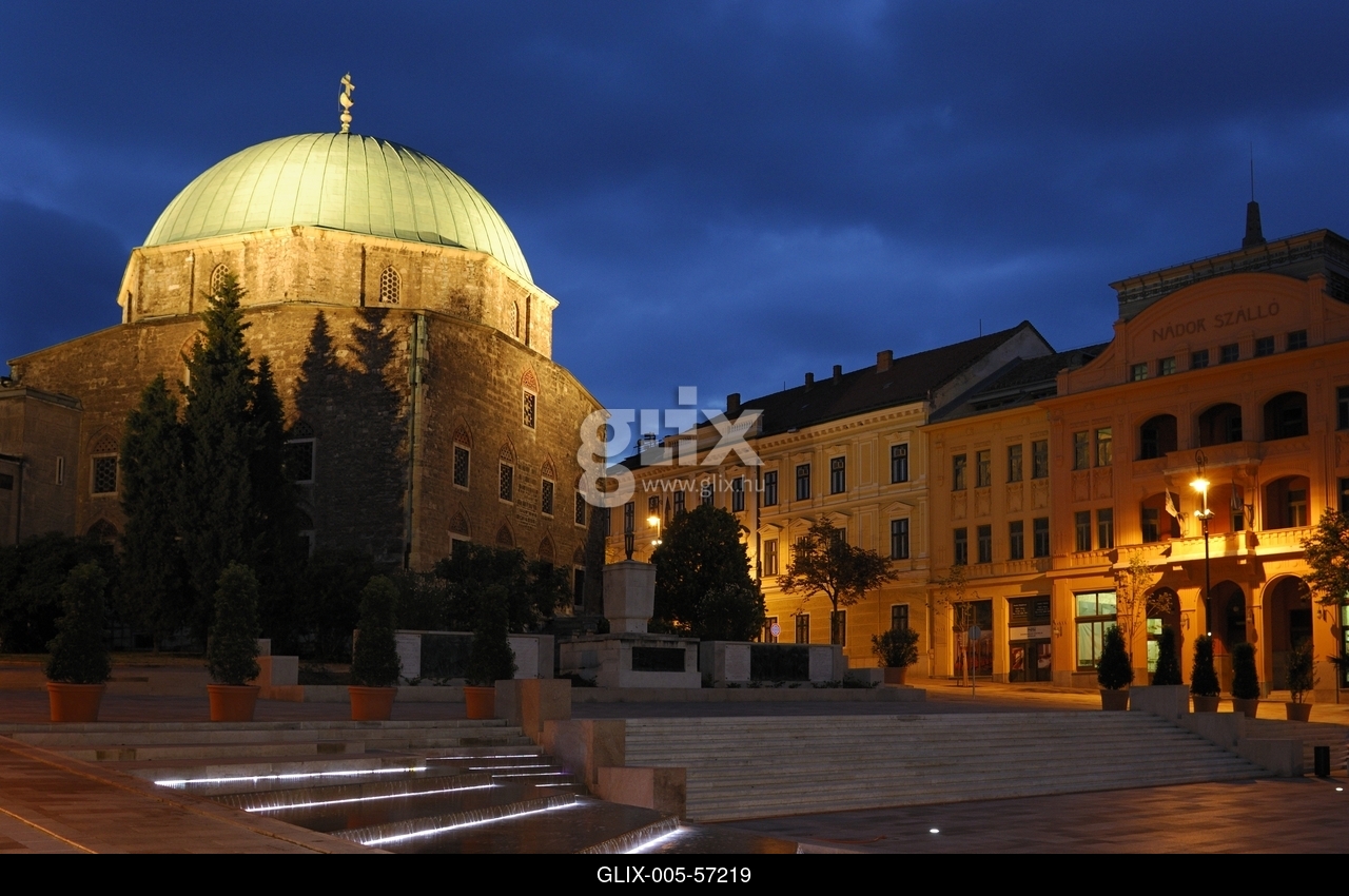 Esti fényben a felújított Széchenyi tér Pécsen, a dzsámival.