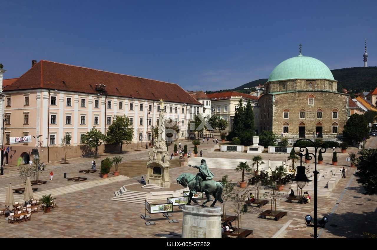 A felújított Széchenyi tér Pécs belvárosában, a dzsámival.
