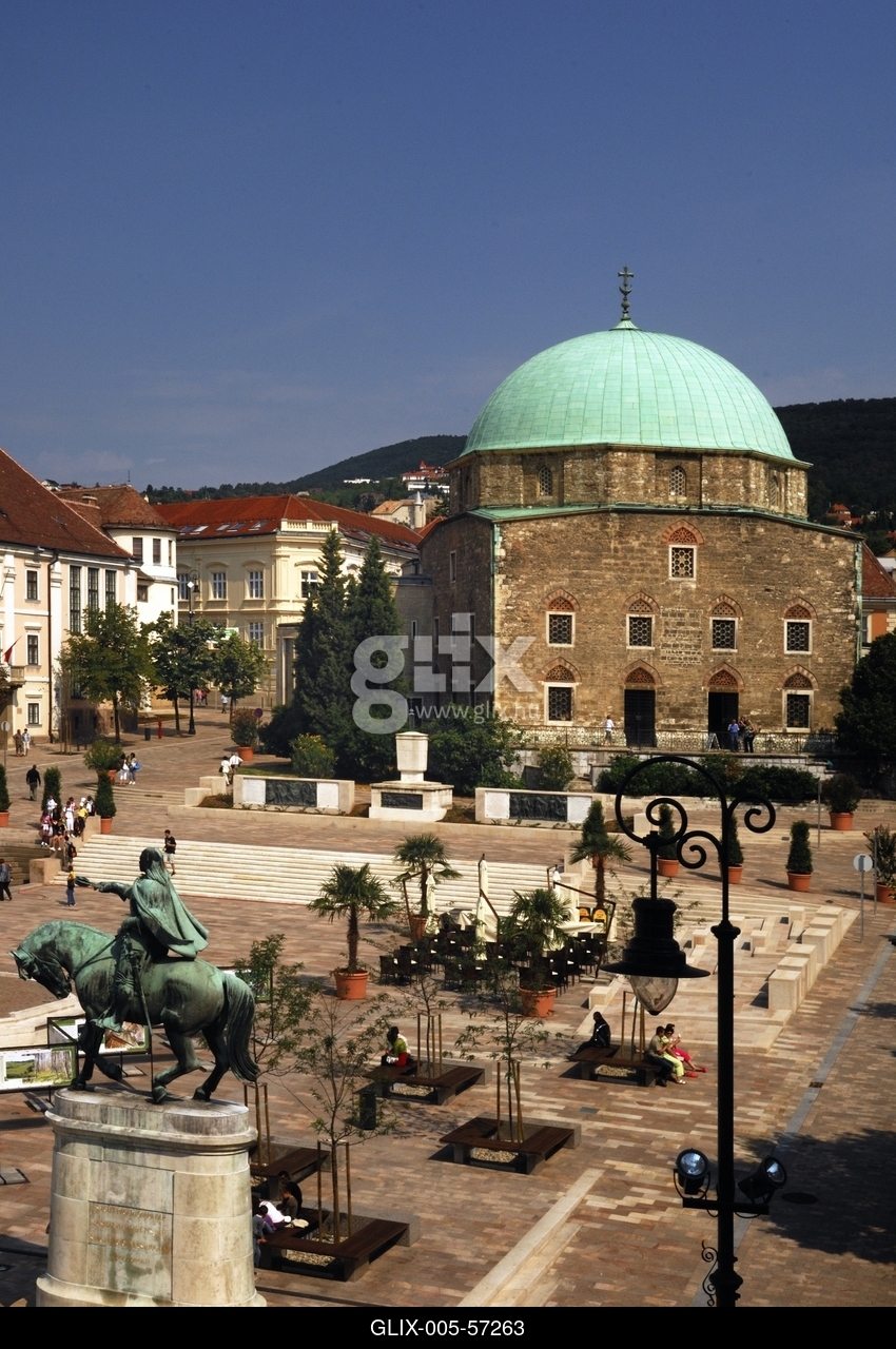 A felújított Széchenyi tér Pécs belvárosában, a dzsámival.
