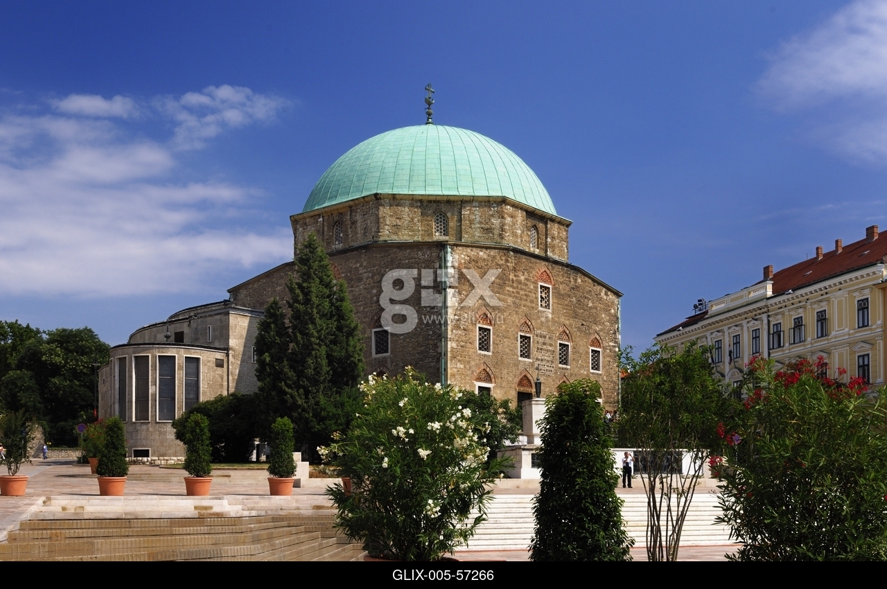 A felújított Széchenyi tér Pécs belvárosában, a dzsámival.