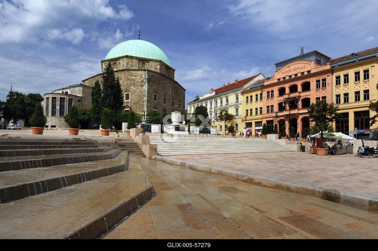 A felújított Széchenyi tér Pécs belvárosában, a dzsámival és a Nádor szállóval.